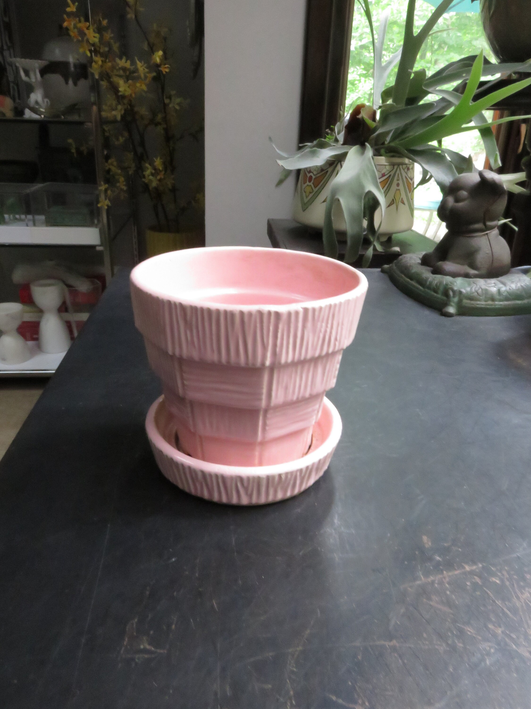 Mccoy 1954 Mid Century Modern Art Pottery Pink Geometric Flower Pot Saucer 14 Ebay